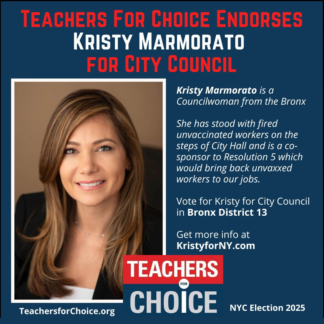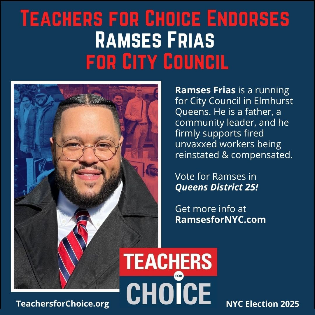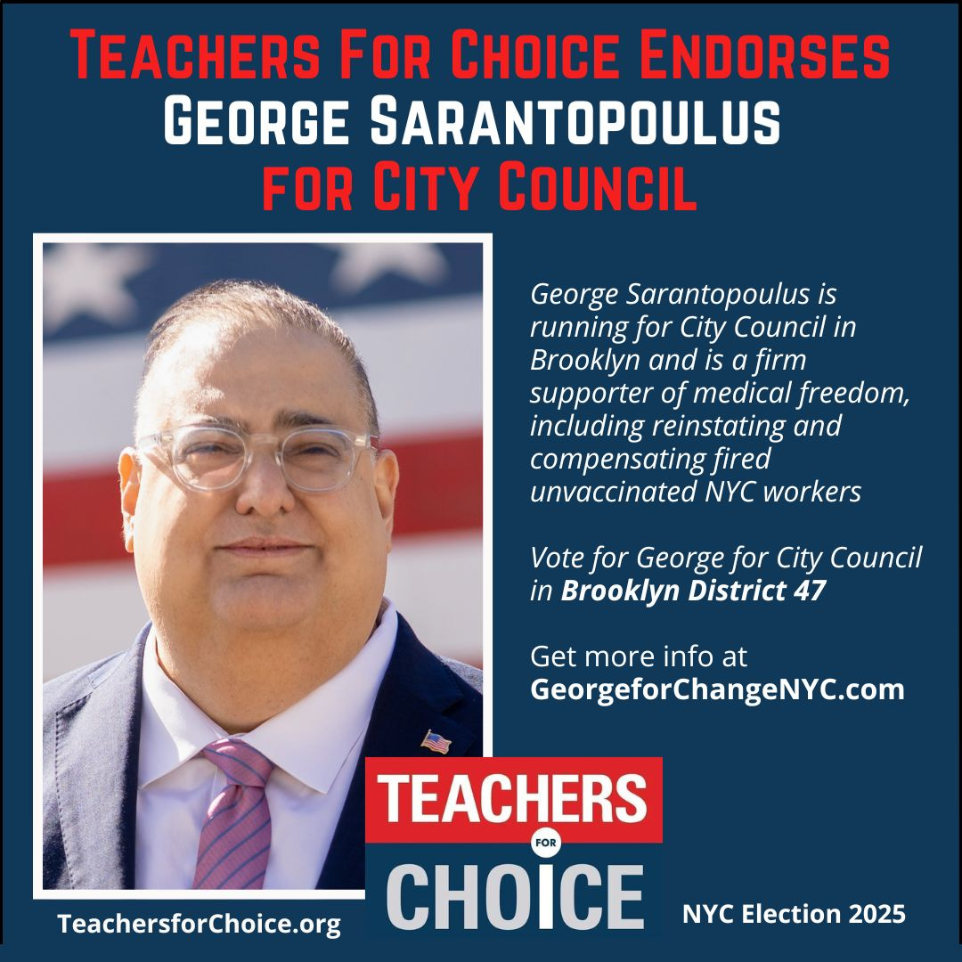 TEACHERS FOR CHOICE (TFC) makes political endorsements solely on a candidate’s position regarding medical and health freedom. For NYC Mayor and City Council elections the main issue we are focused on is that of fired unvaccinated workers. We endorse candidates for City Council who support reinstating and compensating workers fired for declining the COVID shot.