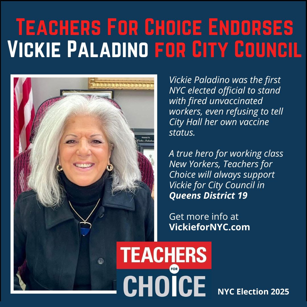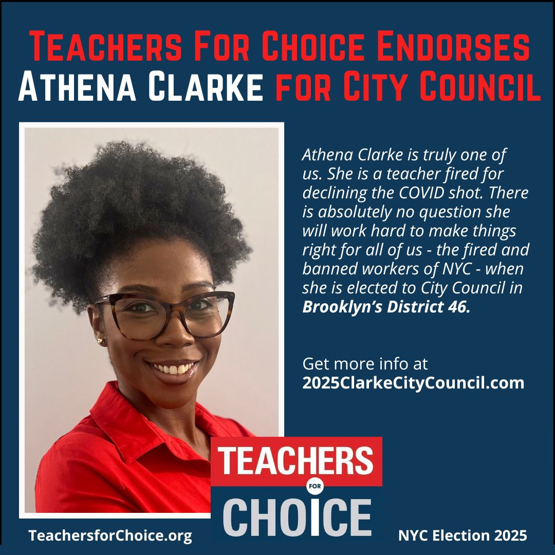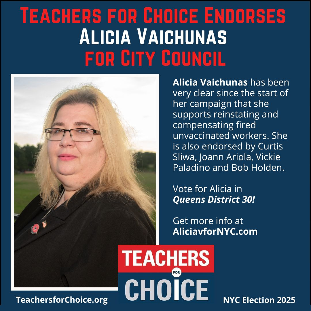 TEACHERS FOR CHOICE (TFC) makes political endorsements solely on a candidate’s position regarding medical and health freedom. For NYC Mayor and City Council elections the main issue we are focused on is that of fired unvaccinated workers. We endorse candidates for City Council who support reinstating and compensating workers fired for declining the COVID shot.