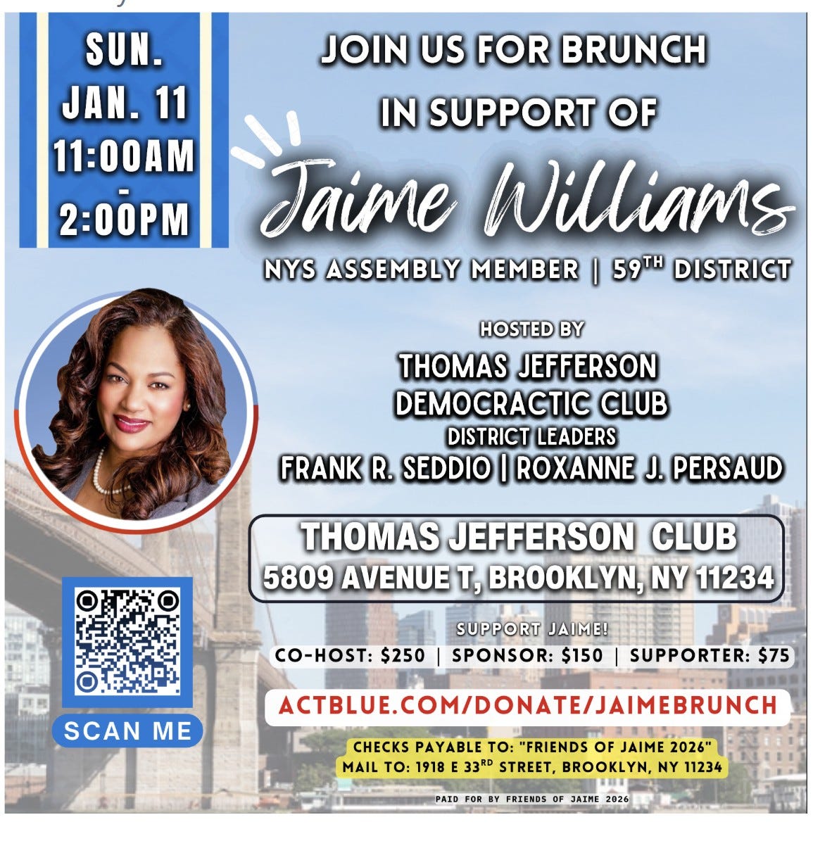 This Sunday there is a fundraiser brunch in Brooklyn sponsored by Frank Seddio and Senator Roxanne Persaud in support of Jaime. Everyone who can should attend and support Assemblywoman Jaime Williams, and if you can’t attend please donate to Jaime’s campaign.