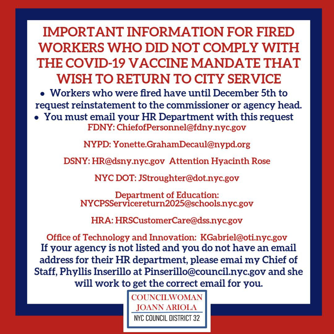 ***REMEMBER*** Fired Unvaxxed NYC workers must send an email to the appropriate contact by Friday, December 5, 2025 if interested in reinstatement: