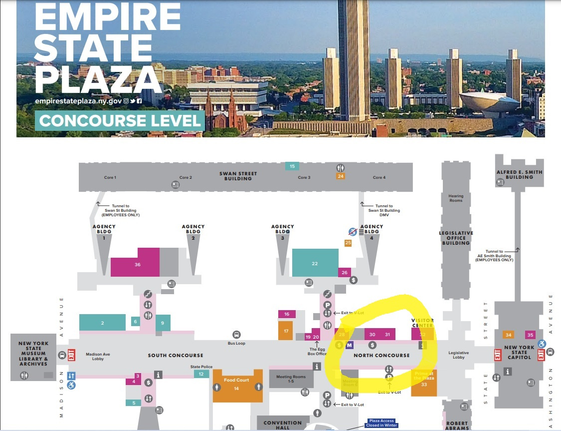 Bring your signs and banners but they should not be on sticks as when we go to enter the Capitol and Legislative Office Building (LOB) security will not allow any sticks in. You can download a pdf that has the above picture in higher quality here: https://empirestateplaza.ny.gov/system/files/documents/2023/11/2023-11_plaza_concourse_level_map.pdf