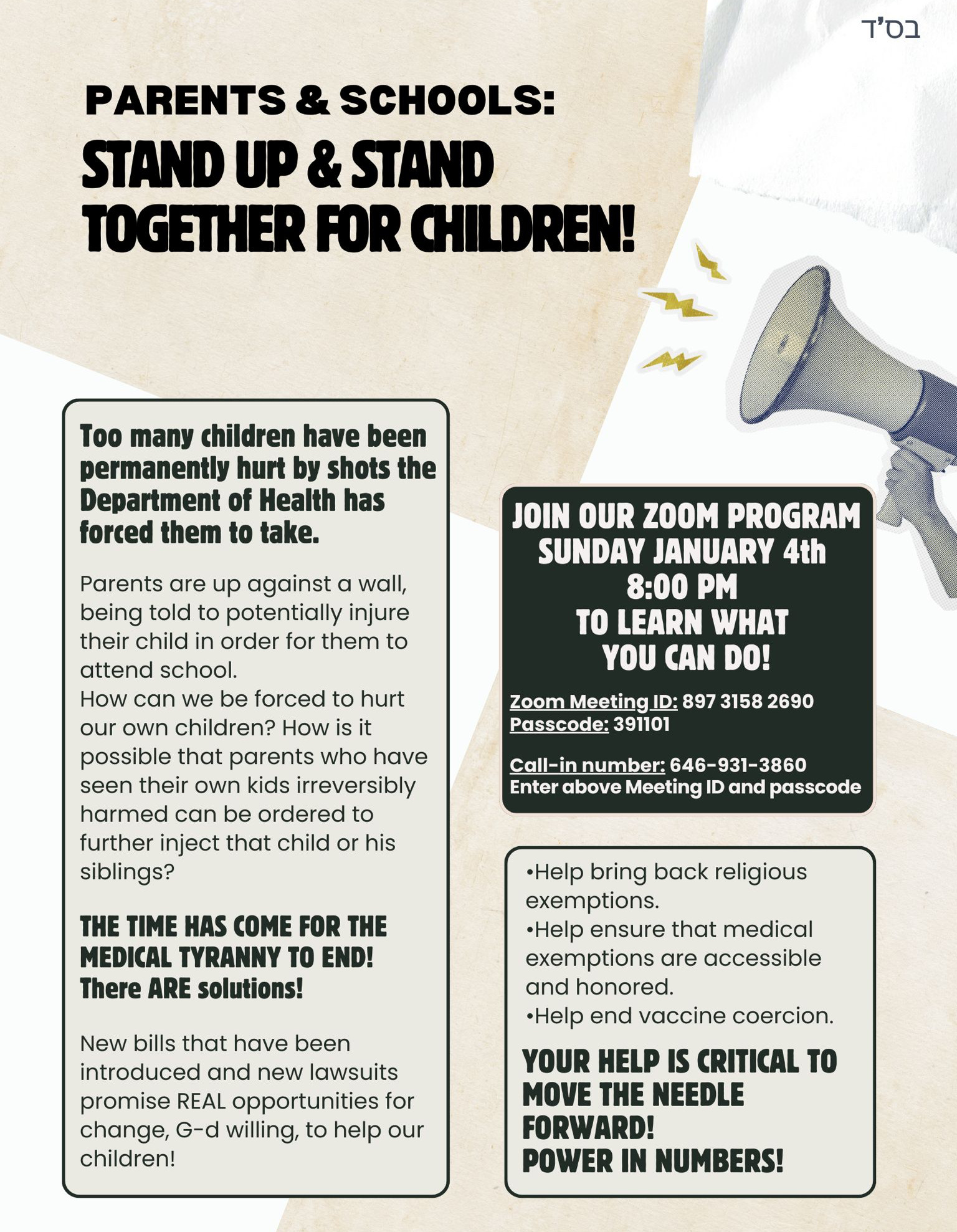 In 2019 NEW YORK became one of only 5 states that do not allow religious exemptions from vaccine mandates to attend school. Almost 30,000 children were expelled within 2 weeks. And New York state has made medical exemptions almost impossible to get. There has been intense discrimination against the Jewish community in this regard which continues still till today. This repression must end!